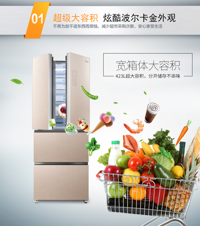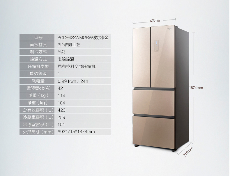 商品名稱:惠而浦冰箱BCD-423WMGBW波爾卡金(jīn)